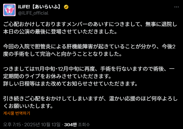 따라서 11월 중순, 12월 중순에 다시 수술을 실시하므로 수술 후 일정 기간의 라이브를 쉬겠습니다.