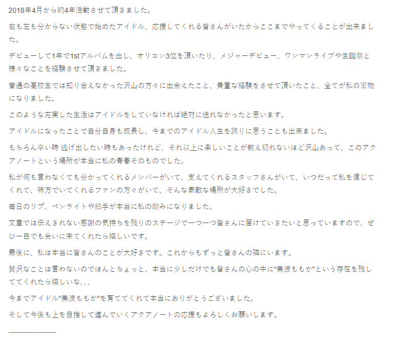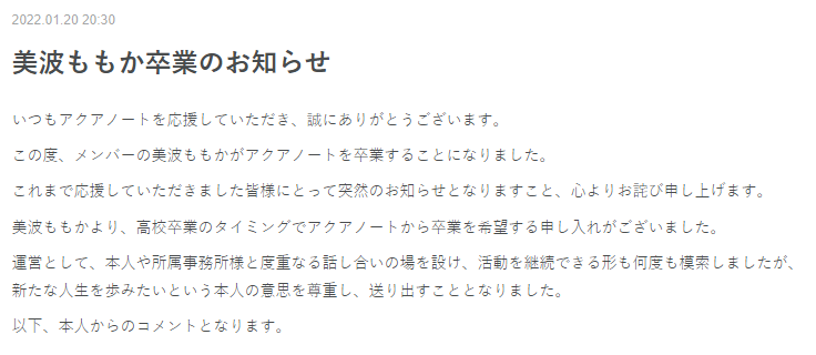 그런 아쿠아노트에서 떠나는 것은 매우 힘들었습니다만, 봄부터 대학에 진학해 거기에서 또 새로운 자신의 인생을 걷고 싶다고 생각해, 고등학교 졸업을 계기로 아이돌을 졸업을 한다고 하는 결정을 했습니다 .