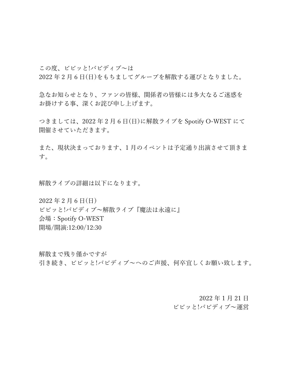 따라서, 2022년 2월 6일(일)에 해산 라이브를 Spotify O-WEST에서 개최하겠습니다.