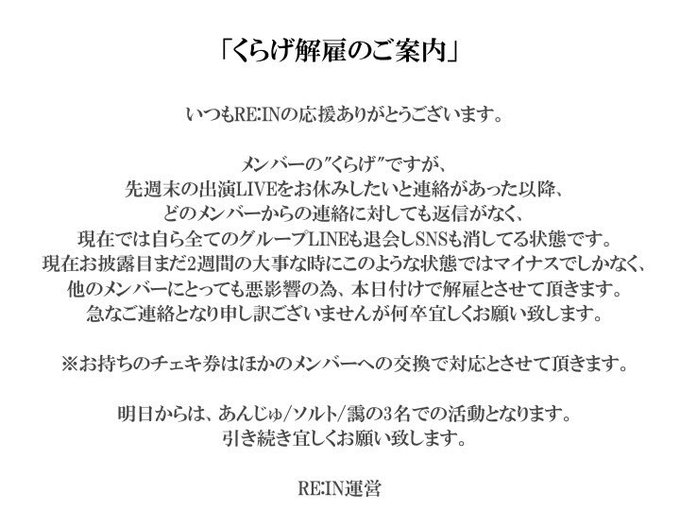 어느 멤버의 연락에 대해서도 회신이 없고, 현재는 스스로 모든 그룹 LINE도 탈퇴하고 SNS도 지운 상태입니다. 현재 공개가 아직 2주의 중요한 시점에 이런 상태로는 마이너스일 뿐 아니라, 다른 멤버에게도 악영향이 있기 때문에 오늘부로 해고하겠습니다. 갑작스럽게 연락드려 죄송합니다만, 모쪼록 잘 부탁드립니다.