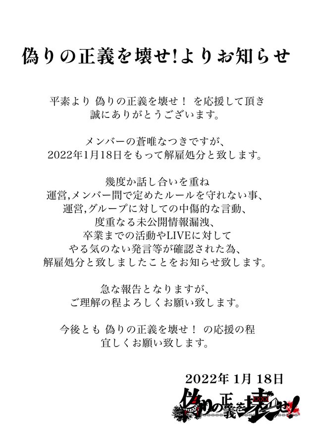 몇 번인가 토론을 거듭해 운영, 멤버간에 정한 룰을 지키지 못하는 것, 운영, 그룹에 대한 비방적 언동, 거듭되는 미공개 정보 유출, 졸업까지의 활동이나 LIVE에 대해 의욕 없는 발언 등이 확인되어 해고 처분을 내렸음을 알려드립니다.