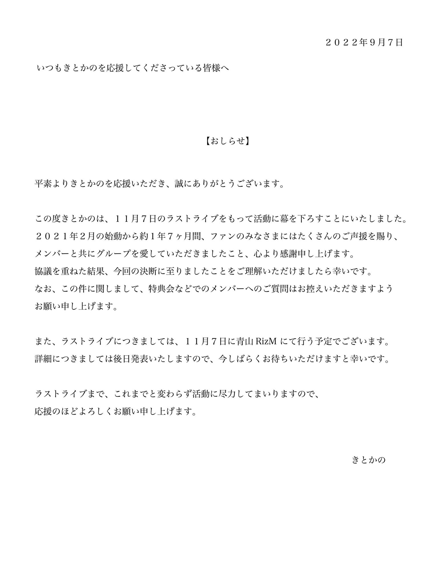 이번 키토카노는 11월 7일 마지막 라이브로 활동에 막을 내리게 되었습니다. 2021년 2월 시동부터 약 1년 7개월 동안 팬 여러분들의 많은 성원을 받고 멤버들과 함께 그룹을 사랑해 주신 점 진심으로 감사드립니다. 협의를 거듭한 결과 이번 결단에 이르게 되었음을 이해해 주시면 감사하겠습니다. 또한, 이 건에 관하여 특전회 등에서의 멤버에 대한 질문은 삼가해 주시기 바랍니다.