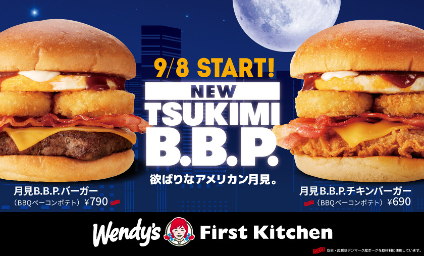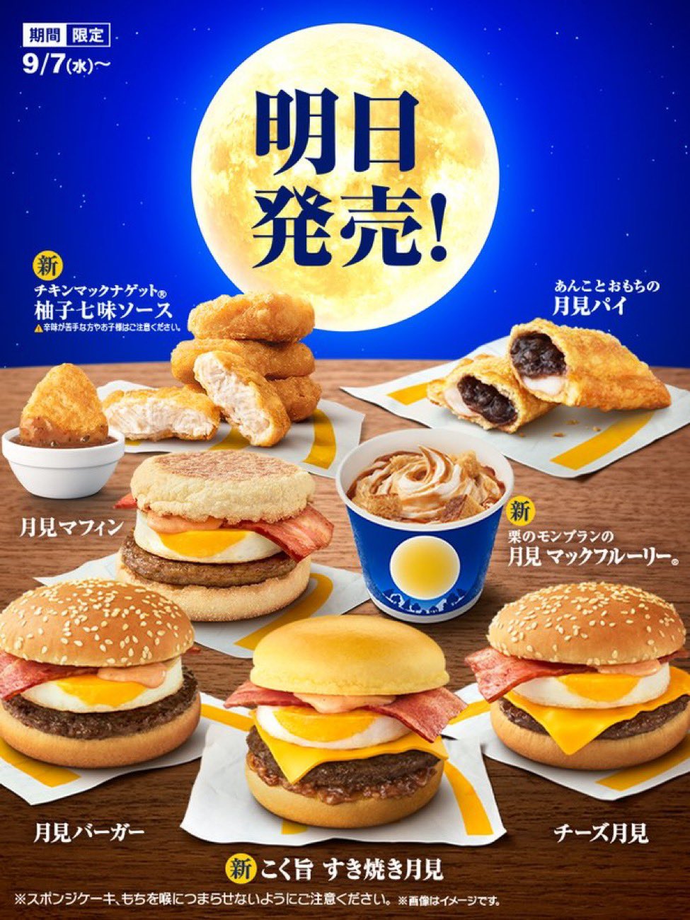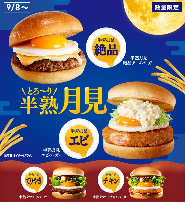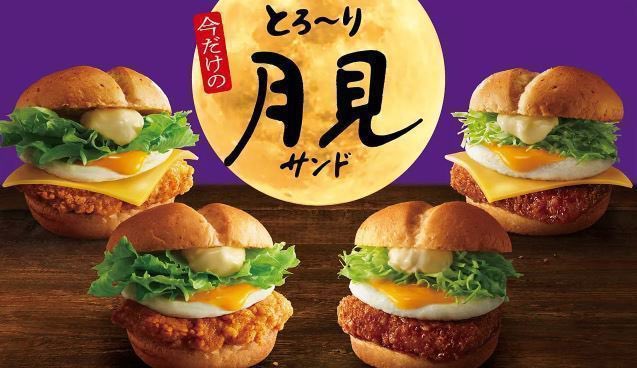 月見 츠키미란 주로 보름달을 보고 즐기는 것을 뜻하며 달걀 노른자를 보름달에 비유한 요리 형태인 츠키미라고 말한다. 그래서 달걀 노른자를 살려둔 계란 후라이를 넣은 버거가 츠키미 버거로 몇년 전부터 9월 초를 전후해 판매하고 있다.