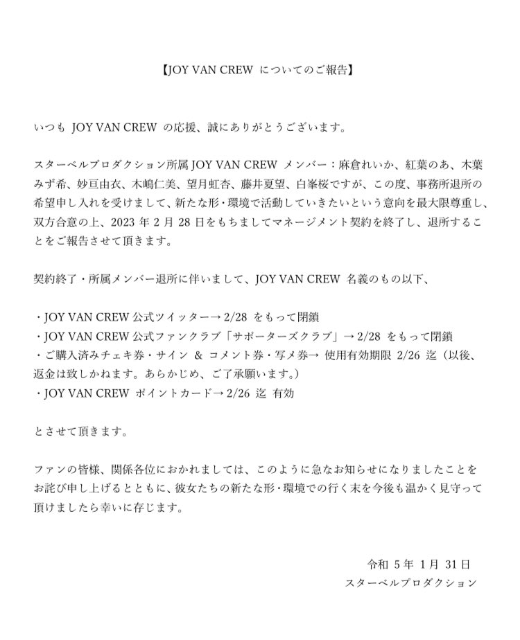 스타벨 프로덕션 소속 JOY VAN CREW 멤버 아사쿠라 레이카, 베니하 노아, 키노하 미즈키, 묘우센 유이, 키지마 히토미, 모치즈키 니코, 후지이 나츠미, 시라미네 사쿠라입니다만, 이번에 사무소 퇴소 희망 신청을 받아 새로운 형태의 환경에서 활동하고 싶다는 의향을 최대한 존중하며, 쌍방 합의 후 2023년 2월 28일부로 매니지먼트 계약을 종료하고 퇴소함을 보고드립니다.