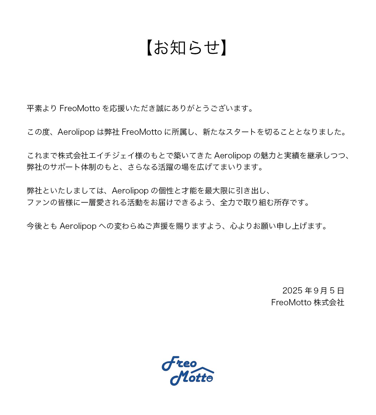 이번에 Aerolipop은 폐사 FreoMotto에 소속되어 새로운 출발을 하게 되었습니다.