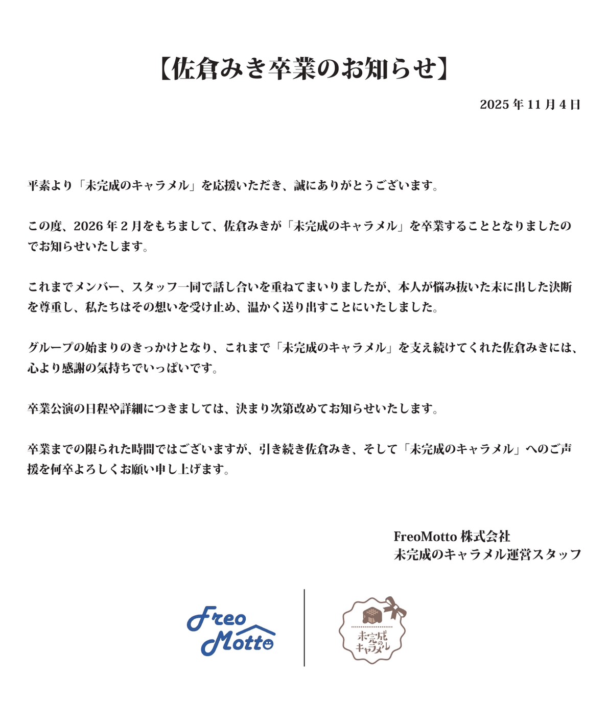 이번에 2026년 2월을 기해, 사쿠라 미키가 미칸세노캬라메루를 졸업하게 되었음을 알려드립니다.