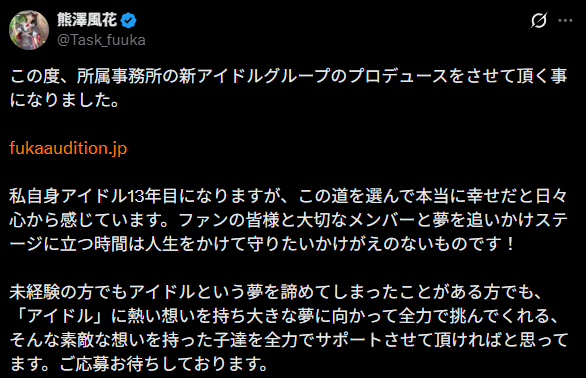 경험이 없는 분이라도 아이돌이라는 꿈을 포기해 버린 적이 있는 분이라도, '아이돌'에 뜨거운 마음을 가지고 큰 꿈을 향해 전력으로 도전해 주는, 그런 멋진 마음을 가진 아이들을 전력으로 서포트해 주셨으면 합니다. 응모 기다리고 있겠습니다.