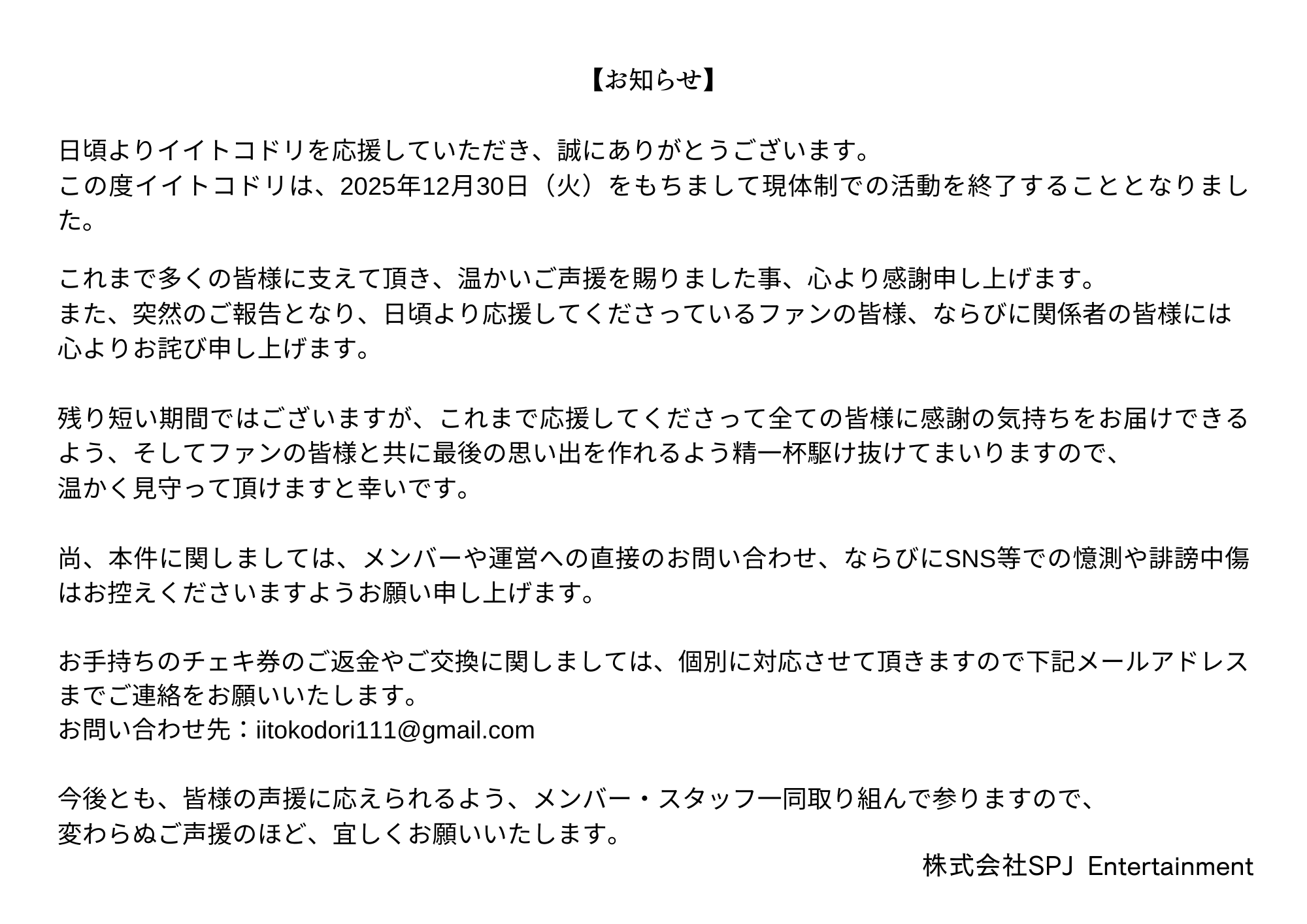 이번에 이이토코도리는 2025년 12월 30일(화)을 마지막으로 현 체제에서의 활동을 종료하게 되었습니다.