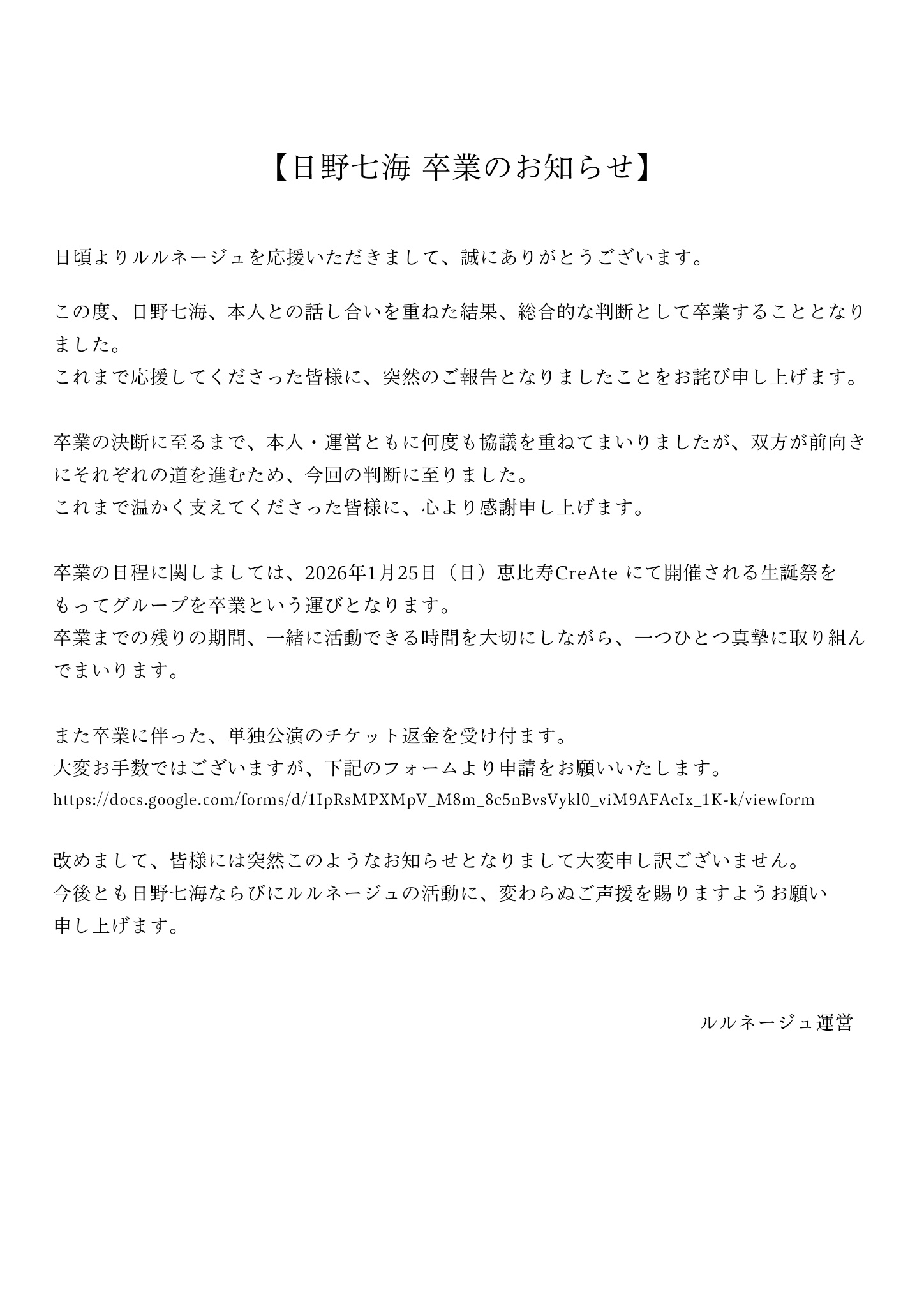 졸업 일정에 관해서는 2026년 1월 25일(일) 에비스 CreAte에서 개최되는 생탄제를 마지막으로 그룹을 졸업하게 됩니다.