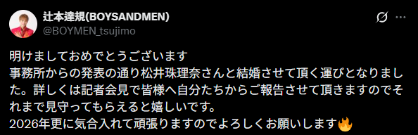 사무소에서 발표한대로 마츠이 쥬리나씨와 결혼하게 되었습니다. 자세한 것은 기자 회견에서 여러분에게 스스로 보고할 테니 그때까지 지켜봐 주시면 좋겠습니다.
