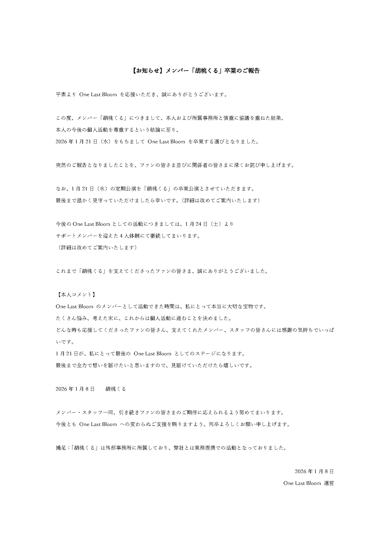 이번에 멤버 「쿠루미 쿠루」에 대해서, 본인 및 소속 사무소와 신중한 논의를 거듭한 결과, 본인의 향후 개인 활동을 존중한다는 결론에 이르러, 2026년 1월 21일(수)으로 One Last Bloom을 졸업하게 되었습니다.