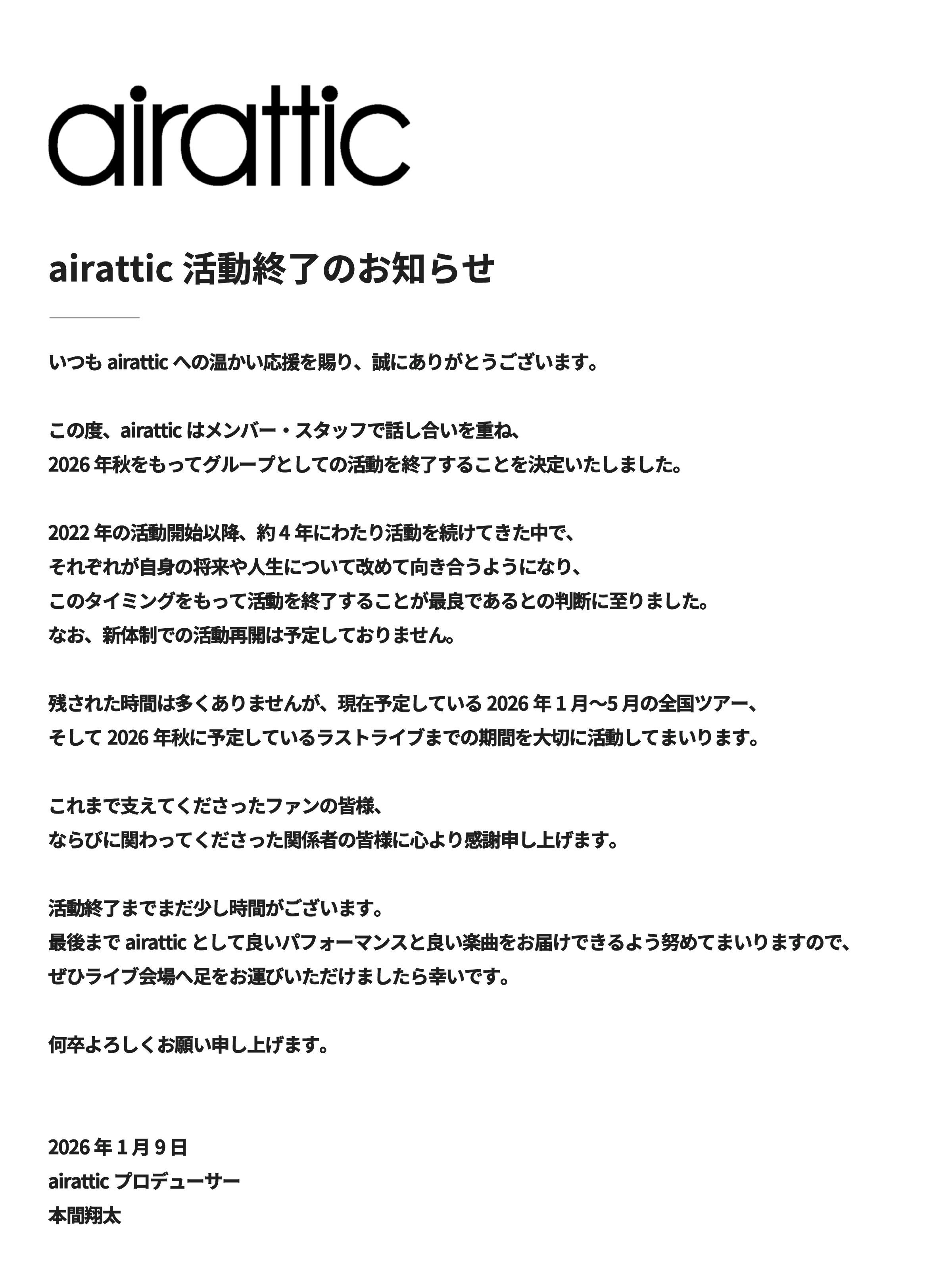 이번에 airattic은 멤버와 스태프 간의 거듭된 논의 끝에, 2026년 가을을 기점으로 그룹으로서의 활동을 종료하기로 결정하였습니다.