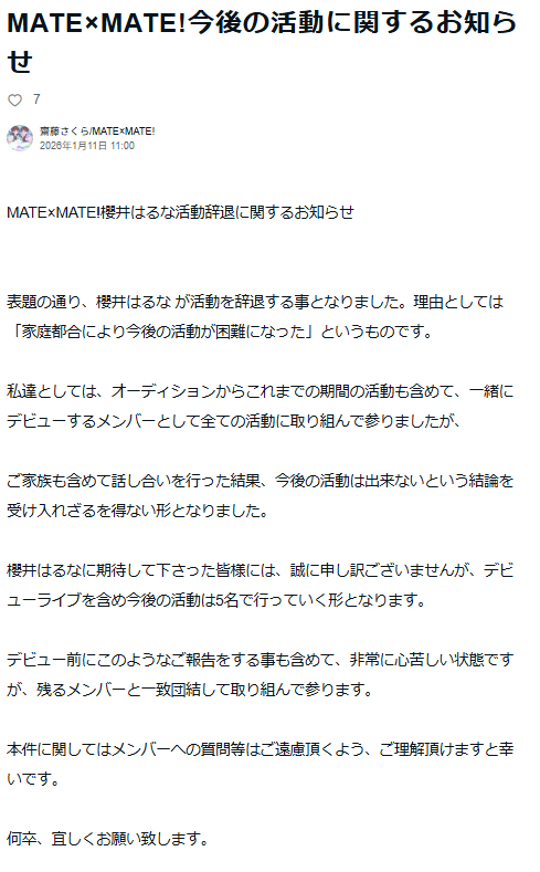 MATE×MATE! 사쿠라이 하루나 활동 사퇴에 관한 공지