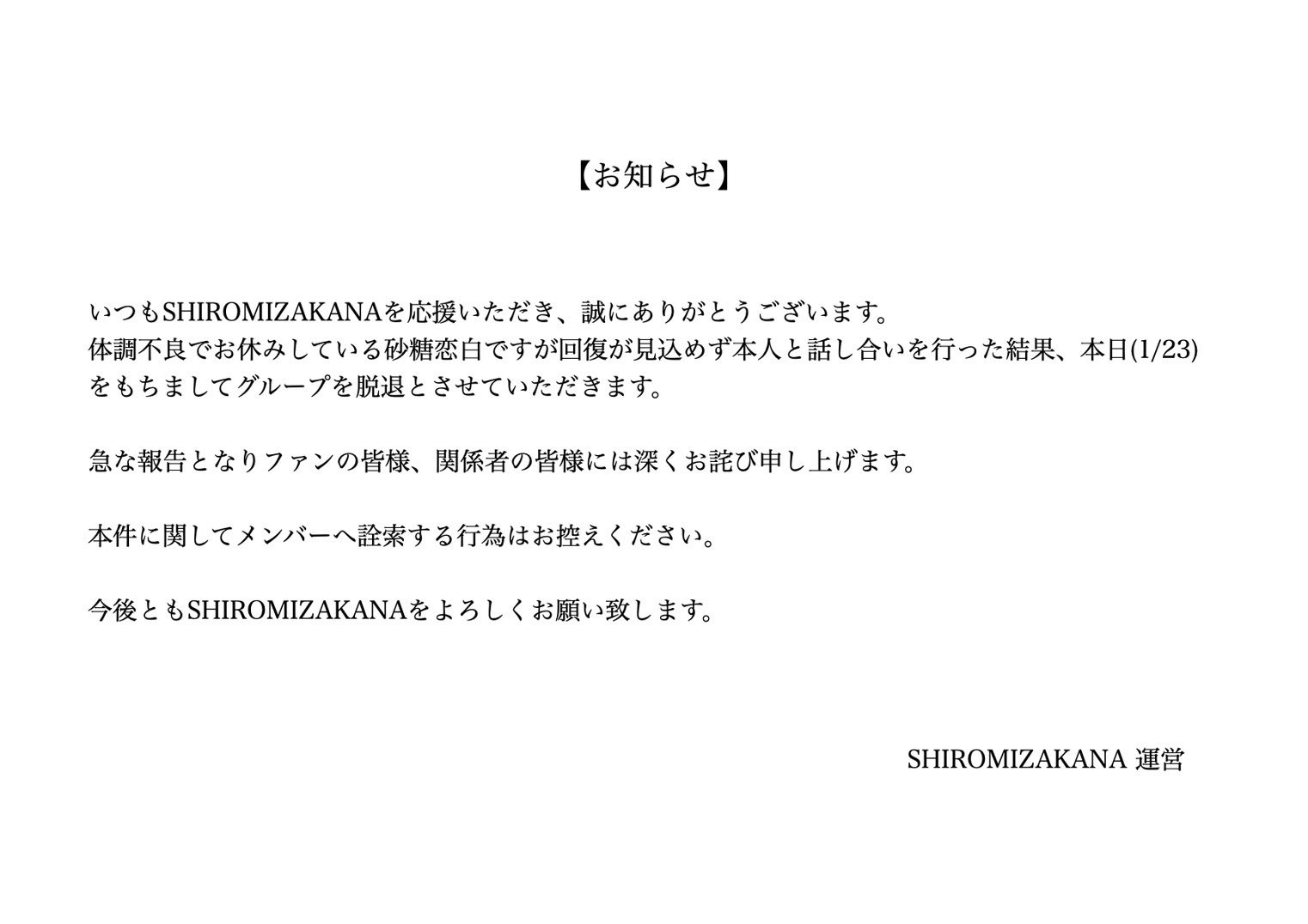 건강 이상으로 휴식 중이었던 사토 코하쿠(砂糖恋白)는 회복될 기미가 보이지 않아 본인과 논의한 결과, 오늘(1/23)부로 그룹을 탈퇴하게 되었습니다.