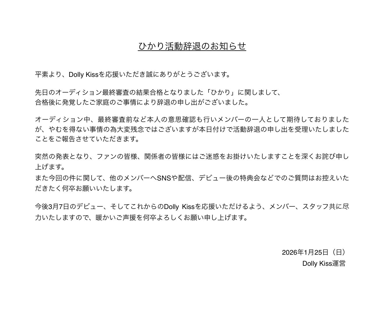 오디션 도중 및 최종 심사 전 등 본인의 의사를 확인하며 멤버의 한 사람으로서 기대하고 있었습니다만, 어쩔 수 없는 사정으로 인해 매우 유감스럽게도 오늘 날짜로 활동 사퇴 신청을 수리하였음을 보고 드립니다.