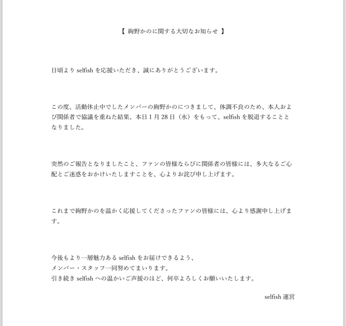 이번에 활동 중단 중이었던 멤버 아야노 카노에 대하여, 컨디션 불량으로 인해 본인 및 관계자와 논의를 거듭한 결과, 오늘 1월 28일(수)로 selfish를 탈퇴하게 되었습니다.