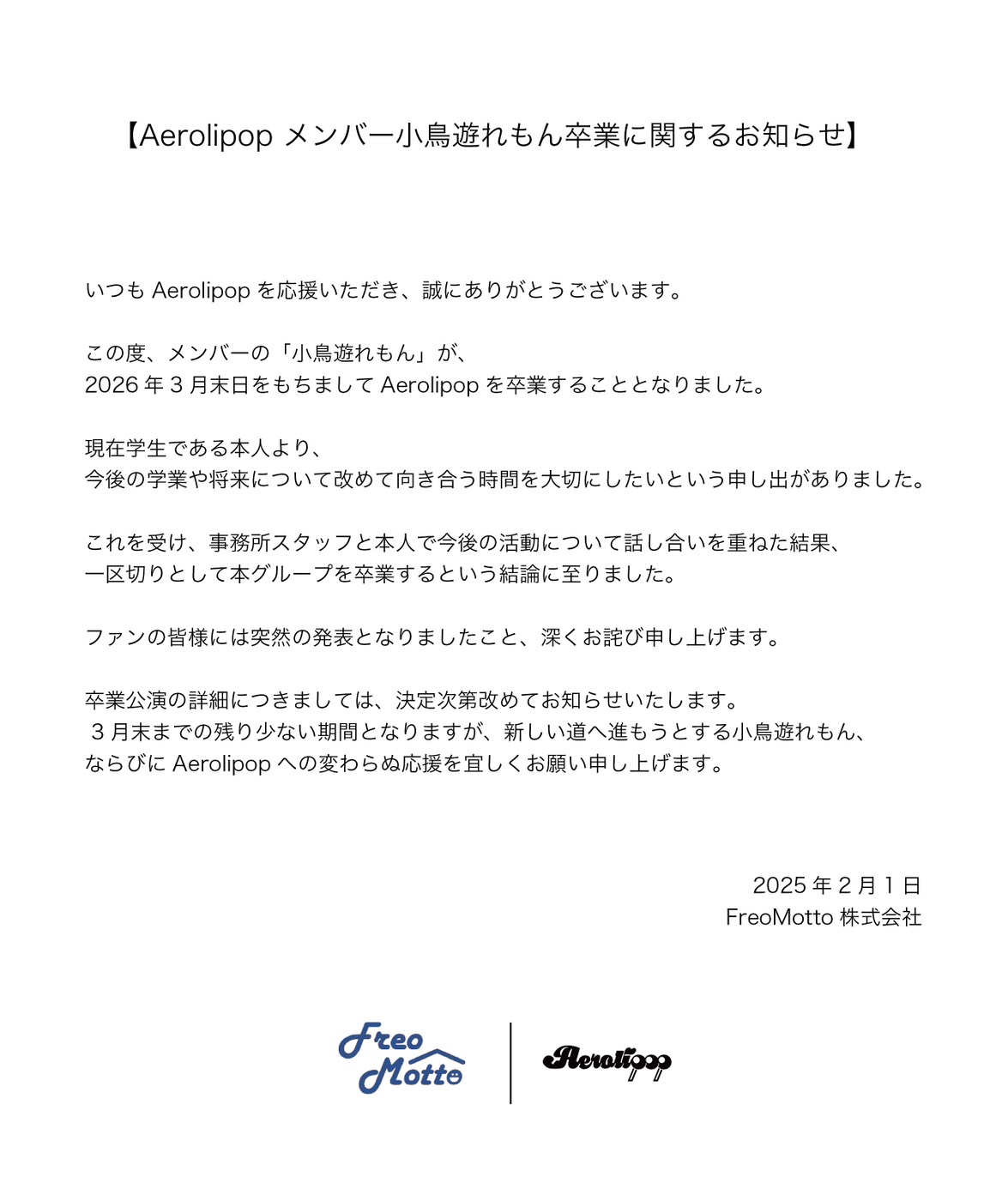 이번에 멤버 ‘타카나시 레몬(小鳥遊れもん)’이 2026년 3월 말일을 기해 Aerolipop을 졸업하게 되었습니다.