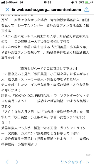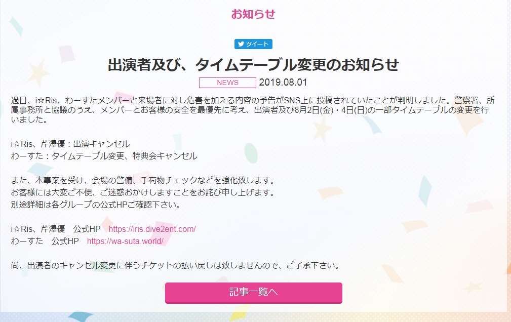 i☆Ris (아이리스)、わーすた (와스타)에는 협박범의 SNS 한줄이 나와서 출연이 취소되거나 스케줄 조정이 되는 사태가 발생.