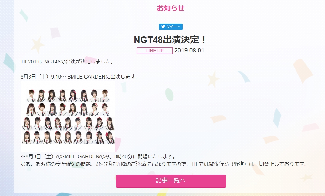 8월 3일에 시작하는 TIF 2019에 NGT48의 출연이 8월 1일 급하게 올라옴. 올해 가장 말많고 탈많은 그룹으로 니가타 지역에서도 버림을 받았다는 소리가 나오는 마당인데 갑자기 첫날 아침 출연이 결정. 반발도 굉장히 심한 공지가 됐다.