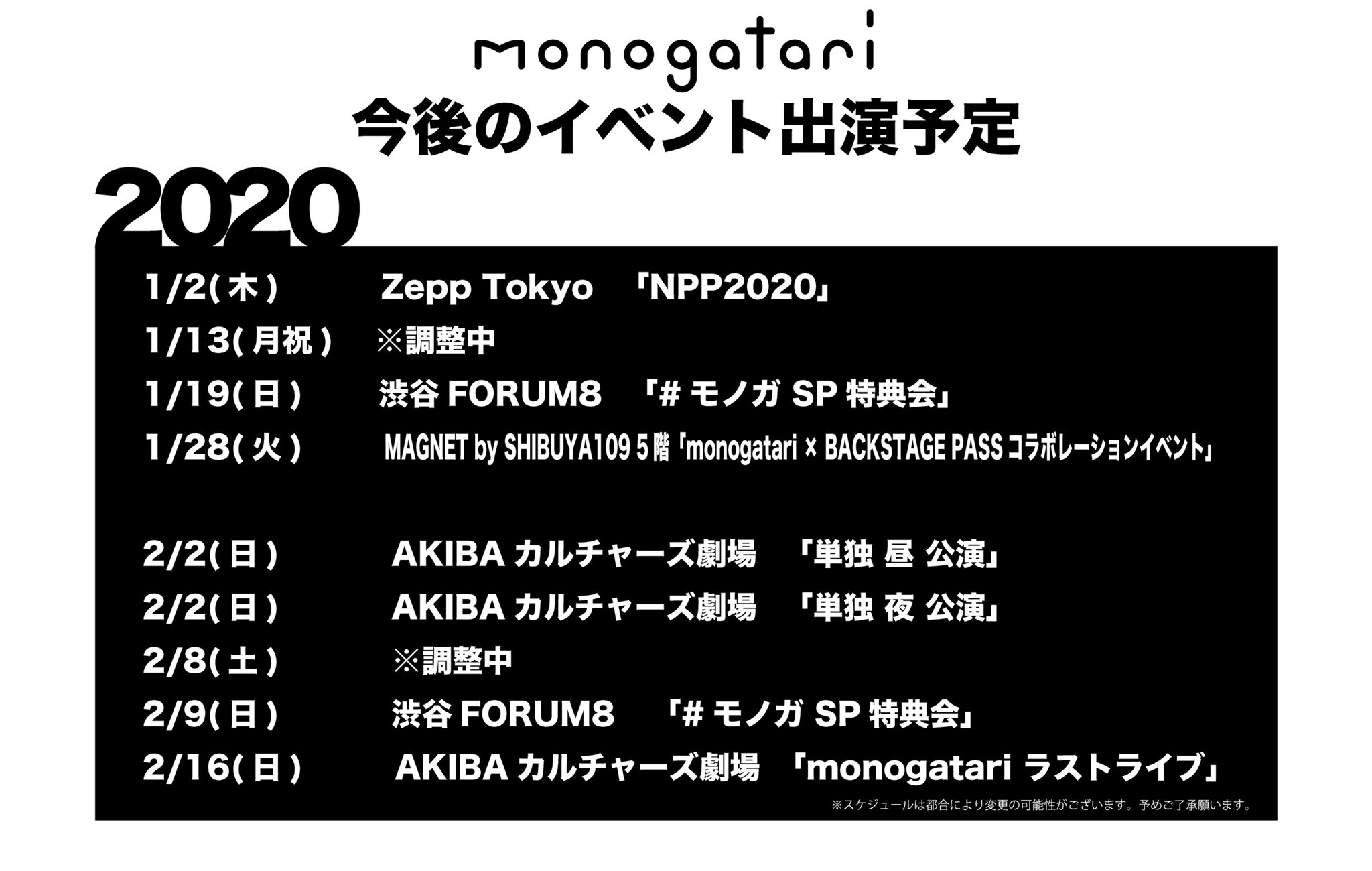 2016년 하라주쿠모노가타리로 인디 아이돌답지 않은 성능을 발휘하며 돌풍을 몰아치던 모노가의 역사도 2020년 마무리하게 되었다.