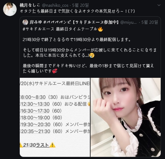 그런데 저 틈새에서 #ババババンビ 바바바밤비의 岸みゆ 키시 미유 이름이 올라와 있었다. 그리고 어제까지의 라인 라이브 투표결과
