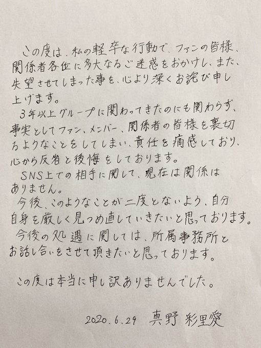 페스티브의 간판 멤버 真野彩里愛 마노사리아의 프리쿠라가 SNS에 올라오고 자필 사과문도 바로 올라왔다.