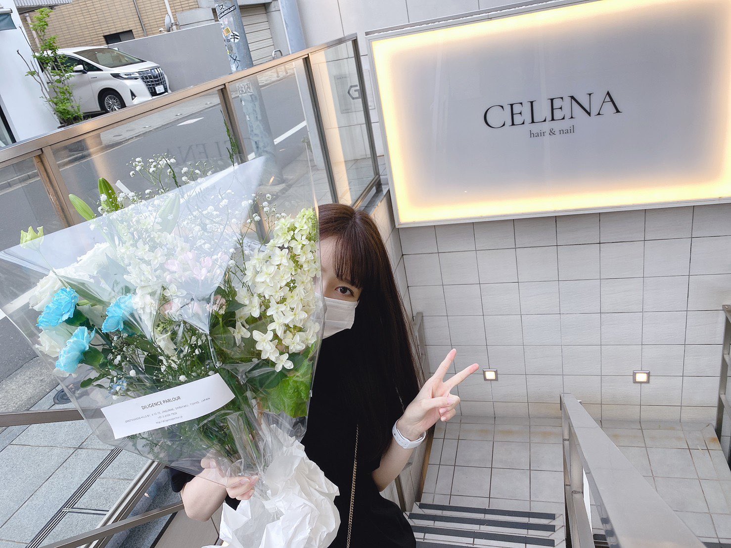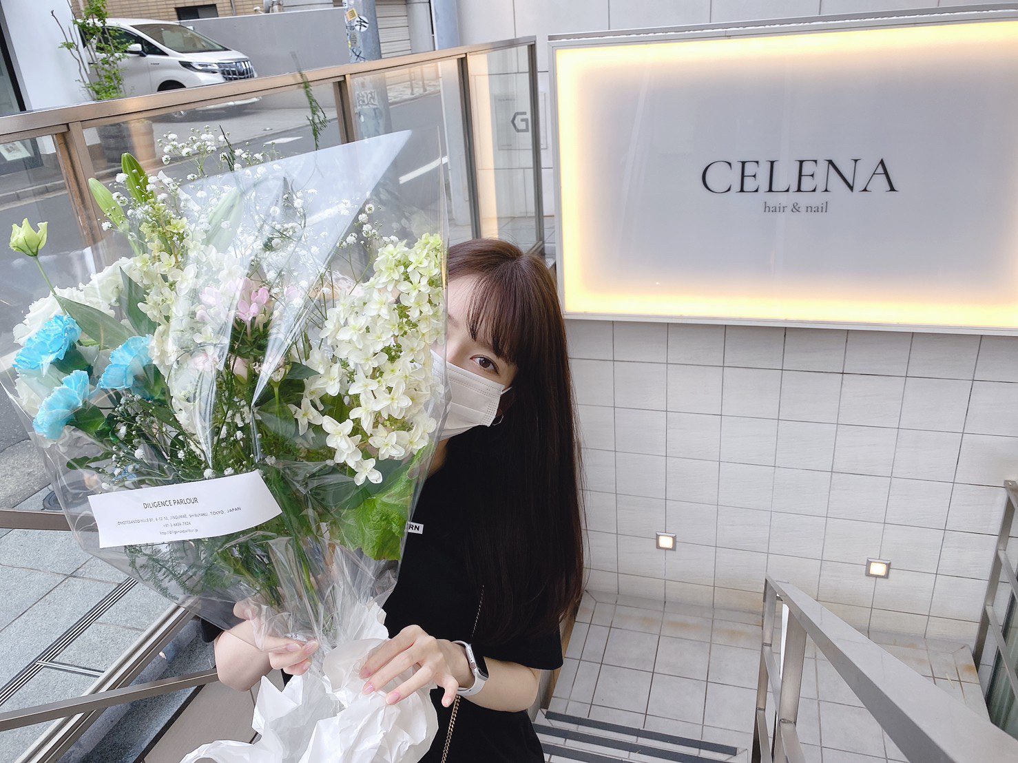 친한 미용사의 헤어&네일 살롱 오픈을 축하하며 꽃다발을 전해주러 온 하시모토 나나미의 사진이 올라왔다. SNS에 사진을 올리는 것을 본인에게 허락을 받았다고 하는 사진.