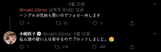 "한글이 기분 나쁘니 팔로우를 취소합니다."