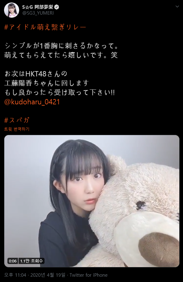 “#アイドル萌え繋ぎリレー シンプルが1番胸に刺さるかなって。 萌えてもらえてたら嬉しいです︎。笑 お次はHKT48さんの 工藤陽香ちゃんに回します もし良かったら受け取って下さい︎!! @kud