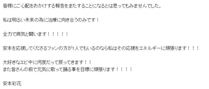 “いつも私立恵比寿中学を応援していただき、ありがとうございます。 安本彩花ですが、悪性リンパ腫と診断され、治療に専念すべく、当面の間休養させていただくことになりました。 復