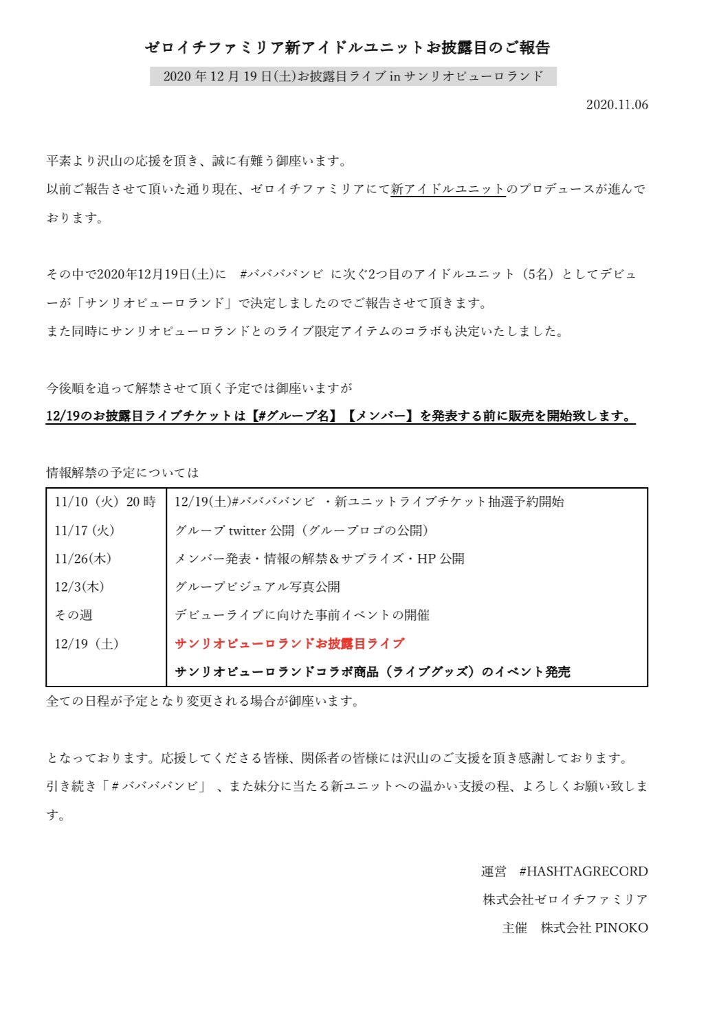 당초 11월 중으로 알려졌던 #HASHTAG record의 신유닛의 공개는 12월 3일로 약간 미뤄졌으며, 12월 19일 산리오 퓨로랜드에서 데뷔 무대를 가질 것을 공지한 것이다. 현재 전직 아이돌 멤버들 중 누가 신유닛 멤버로 들어갈 것인지에 대한 루머가 계속 돌고 있다.