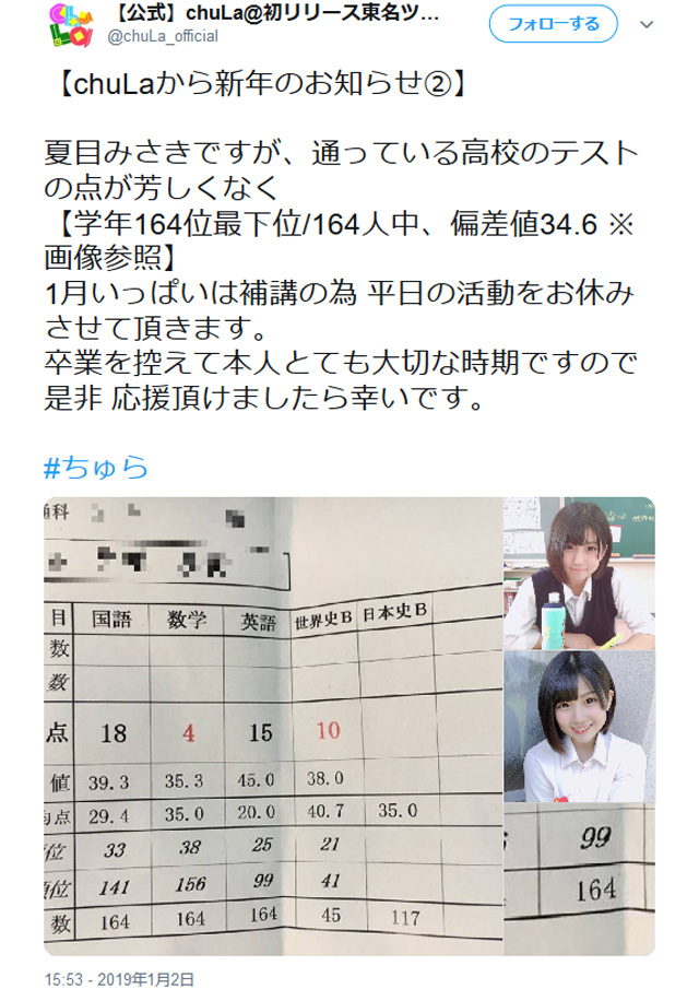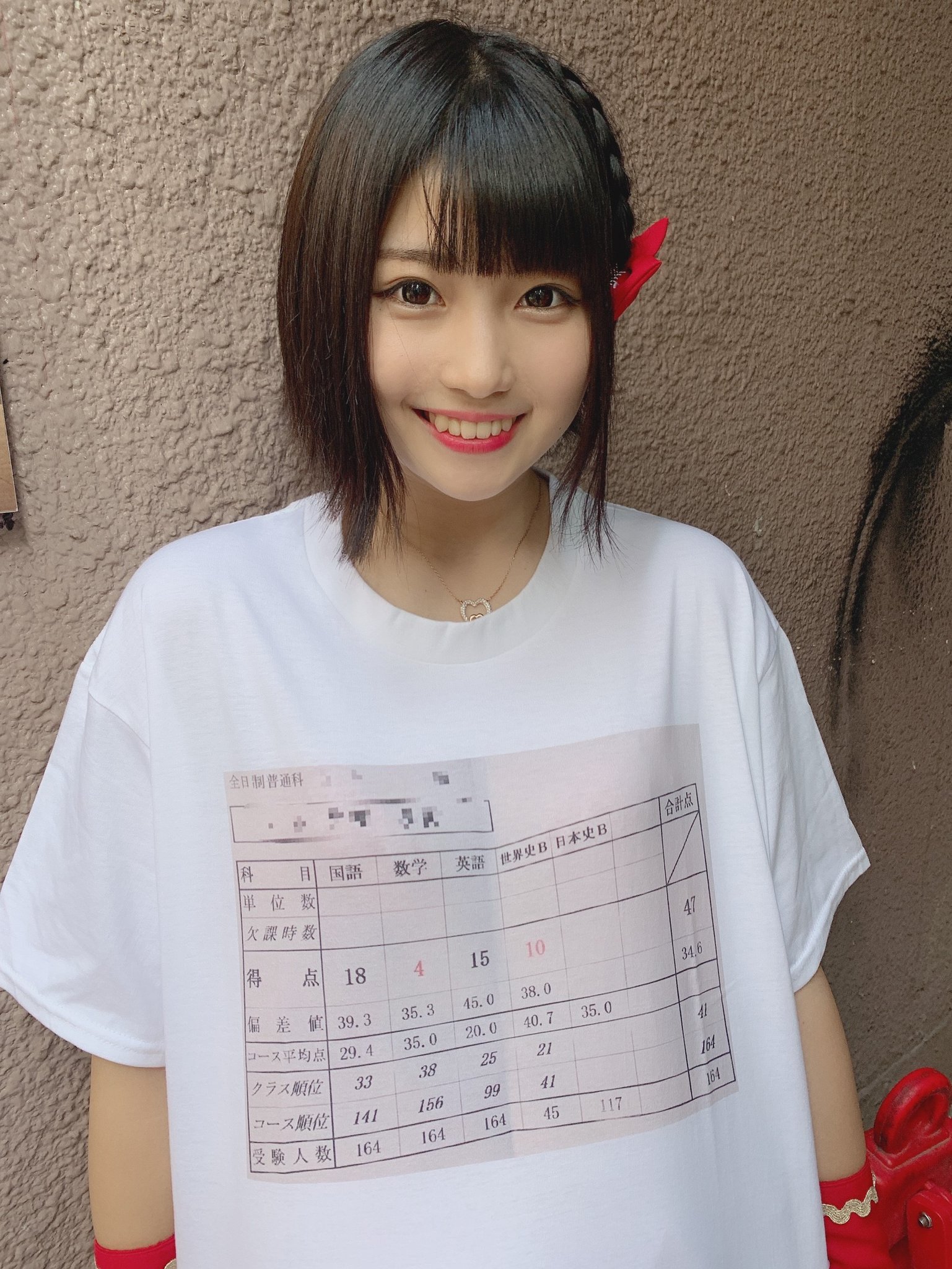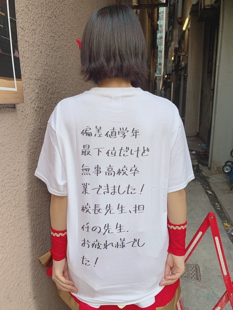 그리고 결국 졸업을 성공(????)하여 기념으로 위에 나오는 "성적표 티셔츠"를 졸업축하 굿즈로 팔기까지 한다. 졸업 성적도 164명 중 164등, 편차치 34.6으로 최하위를 기록을 했지만 어쨌든 졸업은 성공. 이때 생긴 이미지로 偏差値34だけど顔面偏差値100 편차치 34지만 안면편차치100 이라는 슬로건도 생겼다.
