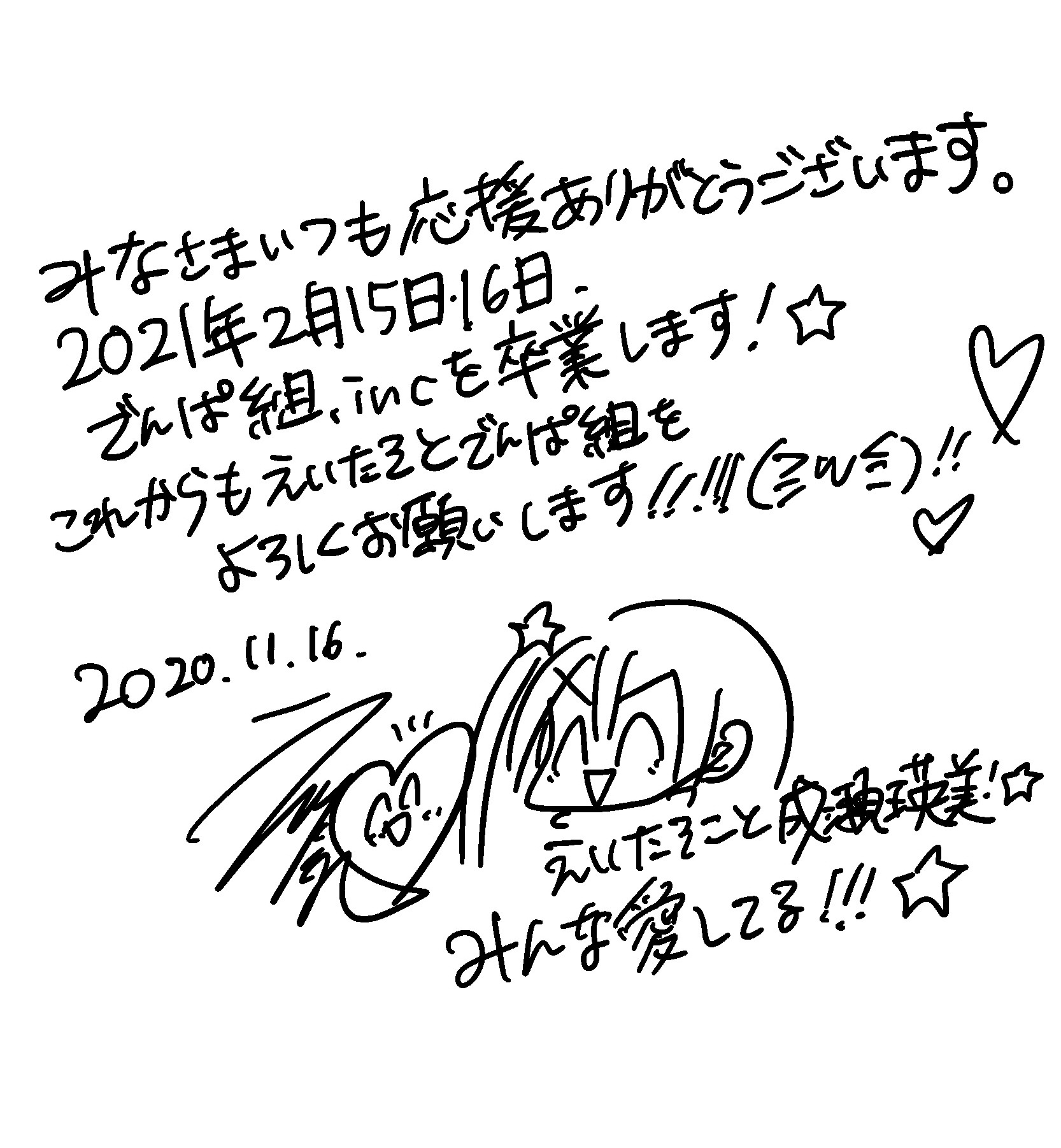 夢眠ねむ 유메미 네무 졸업공연과 마찬가지로 규모있는 졸업공연이 될 예정이다. 나머지 멤버도 졸업을 하면서 덴파구미의 전체적인 리빌딩에 들어가는 것인지, 단순히 에이타소 하나만 졸업하는건지는 아직은 알 수 없다.