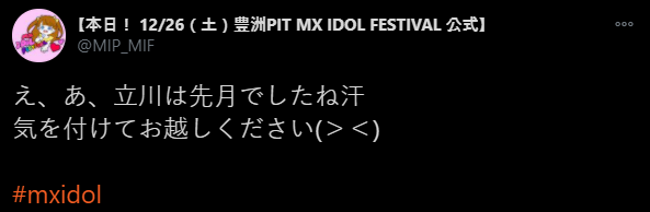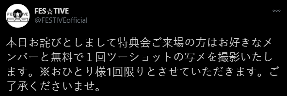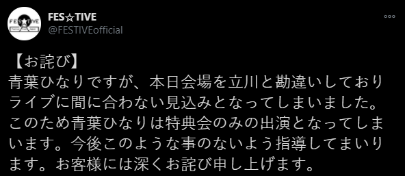 페스티브의 공지. 멤버 青葉ひなり 아오바 히나리가 공연장을 立川 타치가와로 착각하는 바람에 시간에 맞춰 도착 못하고 특전회만 참석하게 되었다는 이야기.
