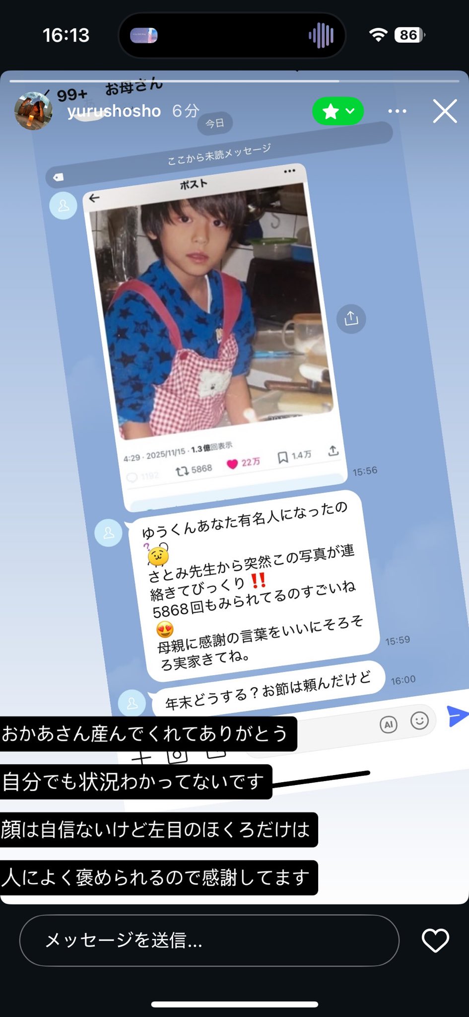 화제가 된 상황에 대해서 어머니와 이야기 나누는 채팅을 스토리로 올렸는데