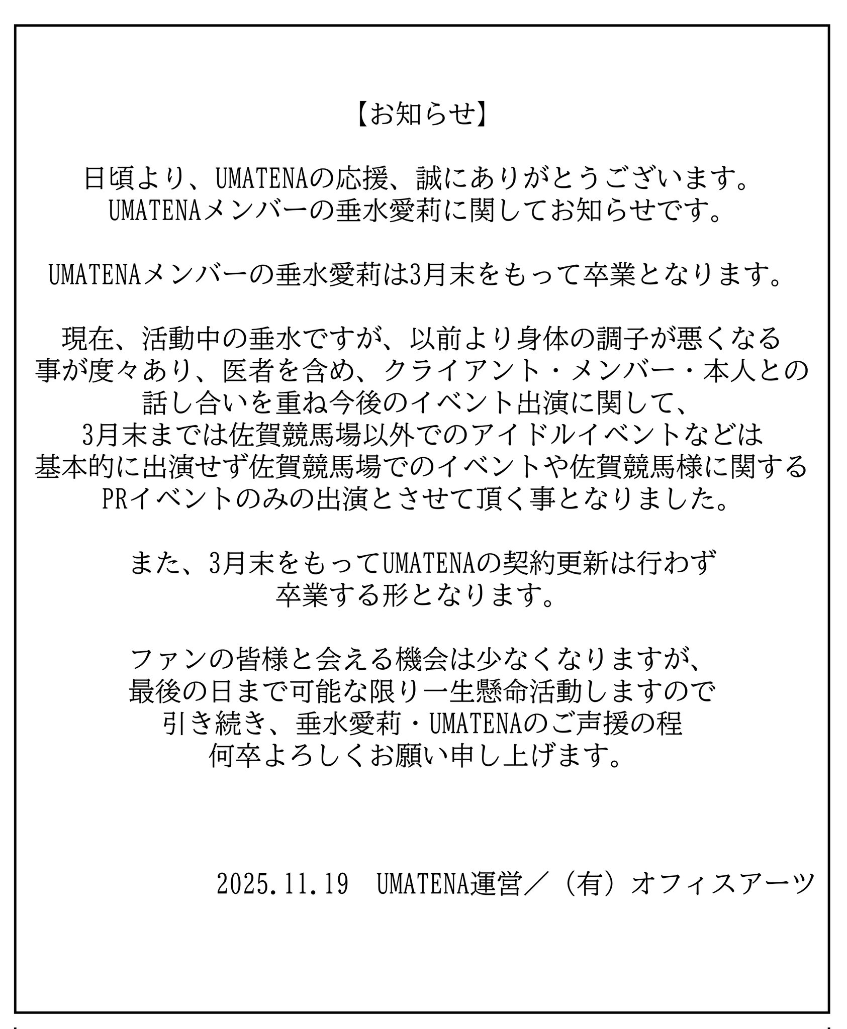 | UMATENA 垂水愛莉 타루미즈 아이리 졸업 공지 (1) | 2025.11.18 |